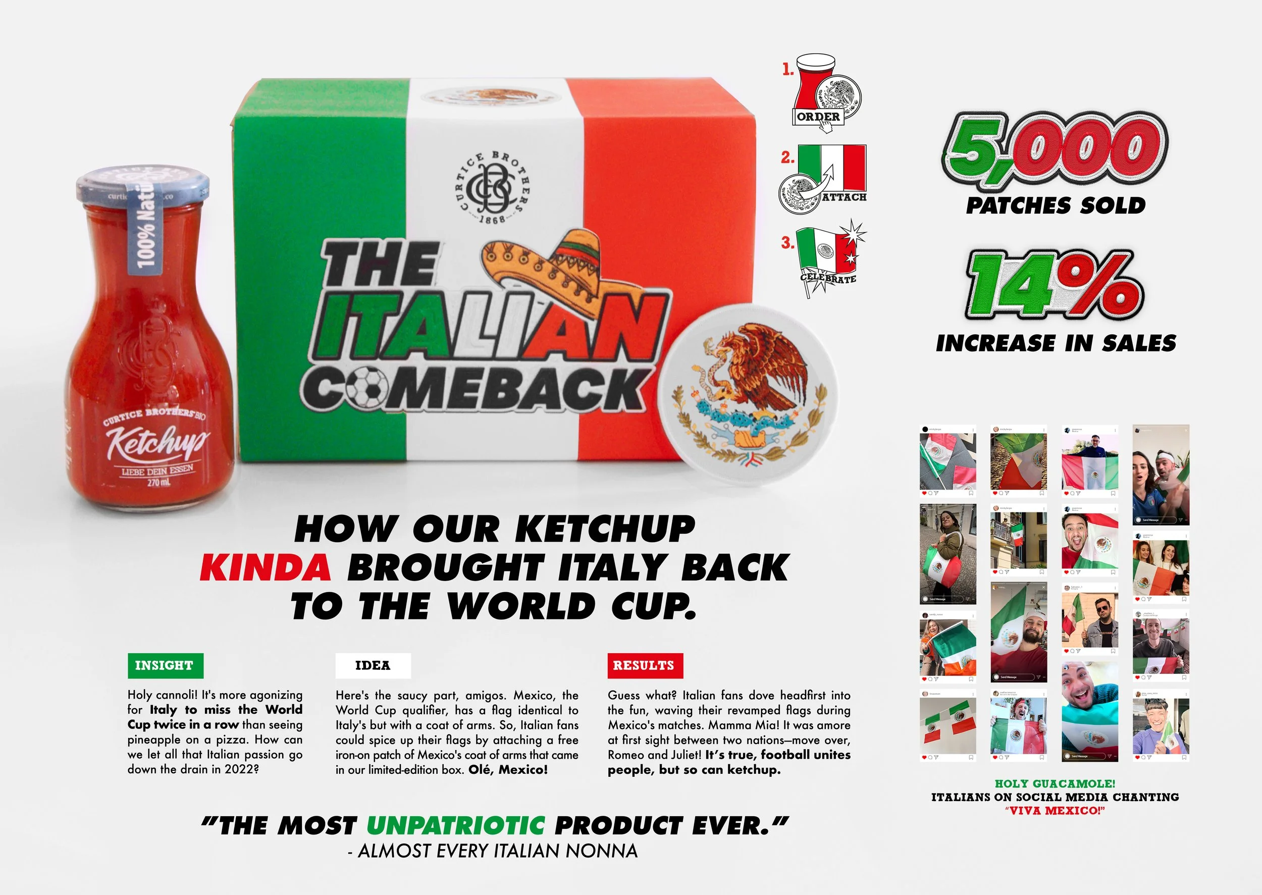 Curtice Brothers Ketchup, made with 100% Italian tomatoes, launched a limited edition ketchup box to help Italian fans enjoy the World Cup. The idea was simple: The flag of the qualifying nation of Mexico looks almost identical as Italy’s flag, just with a coat of arms in the middle. With every box of limited-edition ketchup, a free iron-on patch of Mexico’s coat of arms was included. Fans could easily attach it to their flags, turning them into flags of Mexico.